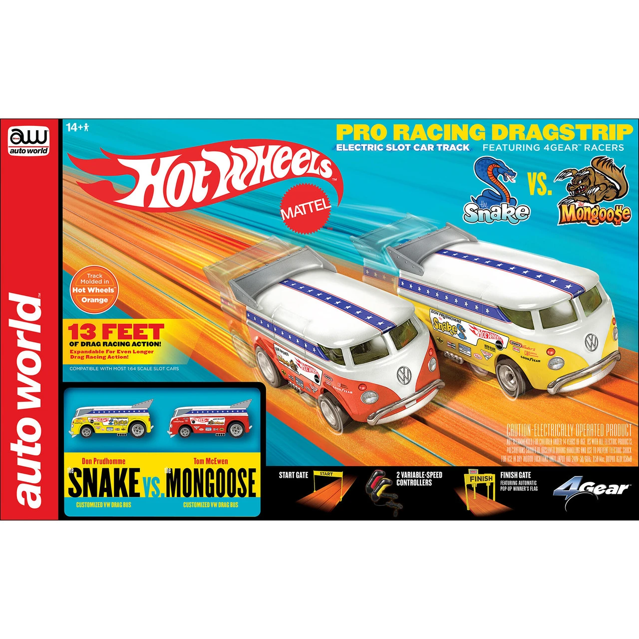 Introducing Auto World’s Hot Wheels Snake versus Mongoose Drag Buses HO scale slot car drag strip race set… 13 feet of realistic drag racing action (Expandable to create an even longer drag set)