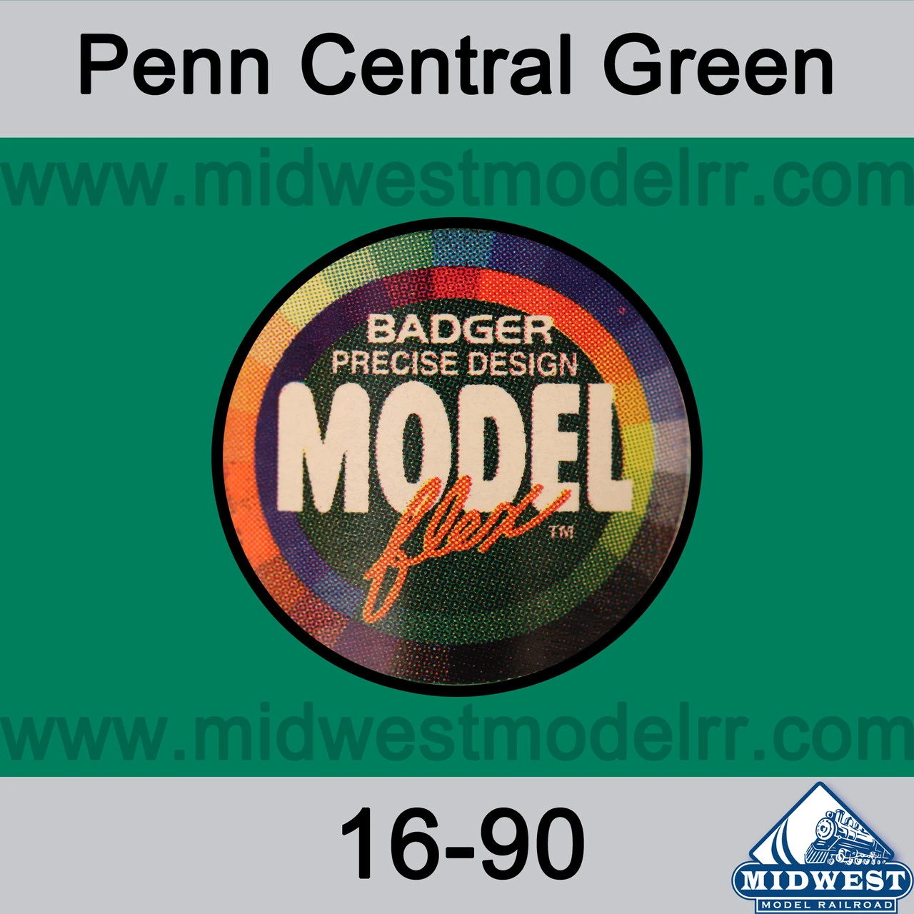 Penn Central Green 16-90 MODELflex Badger PAINT FOR THE PROFESSIONAL MODELER If you’re not satisfied until every detail is perfect, then let MODELflex¨ bring your models to life. It is a superior hobby paint designed to help modelers achieve authentic, professional painting results, with greater ease and proficiency. Waterbased MODELflex¨ is easy to apply with an airbrush or paint brush and clean-up is fast and easy with MODELflex ¨ cleaner. MODELflex¨ paint dries in 12 to 15 minutes at room temperature (3 to 5 minutes if heat dried). FEATURESAvailable in 1 oz plastic bottlesMade of high quality organic pigments for superior color retention and color fastnessMODELflex offers extreme fine-coat coverage without conceling intricate detailsprimers are not required with most colors (primers are recommended with lighter colors)Superior adhesion to most plastics, resins, metals and various other substratesDecaling and detailing may begin in 15 minutes if heat driedEnvironmentally friendly, safe to use, non-flamable, non-cardinogenic