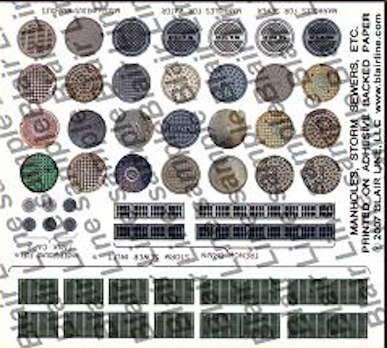 Photos of real manhole covers and storm drains printed on adhesive backed paper and feature cut, peel and stick installation. Great details for streets, sidewalks and industrial facilities.