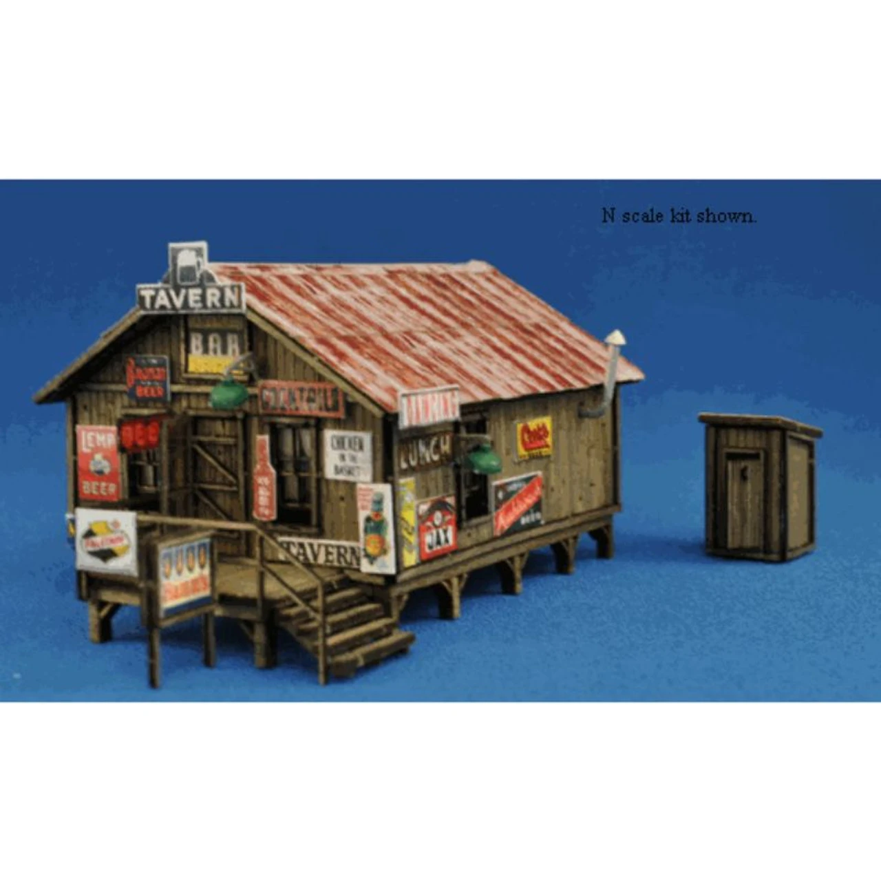 Sam’s Roadhouse kit features: Found at roadside in rural areas or along the outskirts of town this type of roadhouse is based on juke joints that would have offered drink, food, dancing and maybe even a few groceries or “recreational” gambling in the back room. Sam’s is located far enough off the beaten path that an outhouse is provided. Build it without the signs and use it for a house. This kit was inspired by my friend Sam Syzdek’s excellent scratchbuilt model. Kit includes laser-cut wood structures that features laser etched vertical planks with nail holes, knots and imperfections in precision fit tab and slot walls. Laser cut floor has a laser etched porch floor with nail holes etched in random length boards. Laser cut door trim, screen door, window trim and corner trim feature peel-n-stick adhesive for easier assembly. Windows may be installed open or closed. Also includes laser cut handrail, stairs and a stair assembly jig. Stairs may be built on either the right or left side of the porch as shown above. Roadhouse and outhouse have laser-cut peel-n-stick pre-weathered corrugated roofing. Roadhouse includes a cast metal smokejack and outside non-working lamps. Roadside sign frame and a great selection of signs from our extensive collection. Outhouse has fully detailed interior and may be built with door open or closed. N kit dimensions: roadhouse footprint 1.50″ x 2.40″, outhouse .38″ x .38″