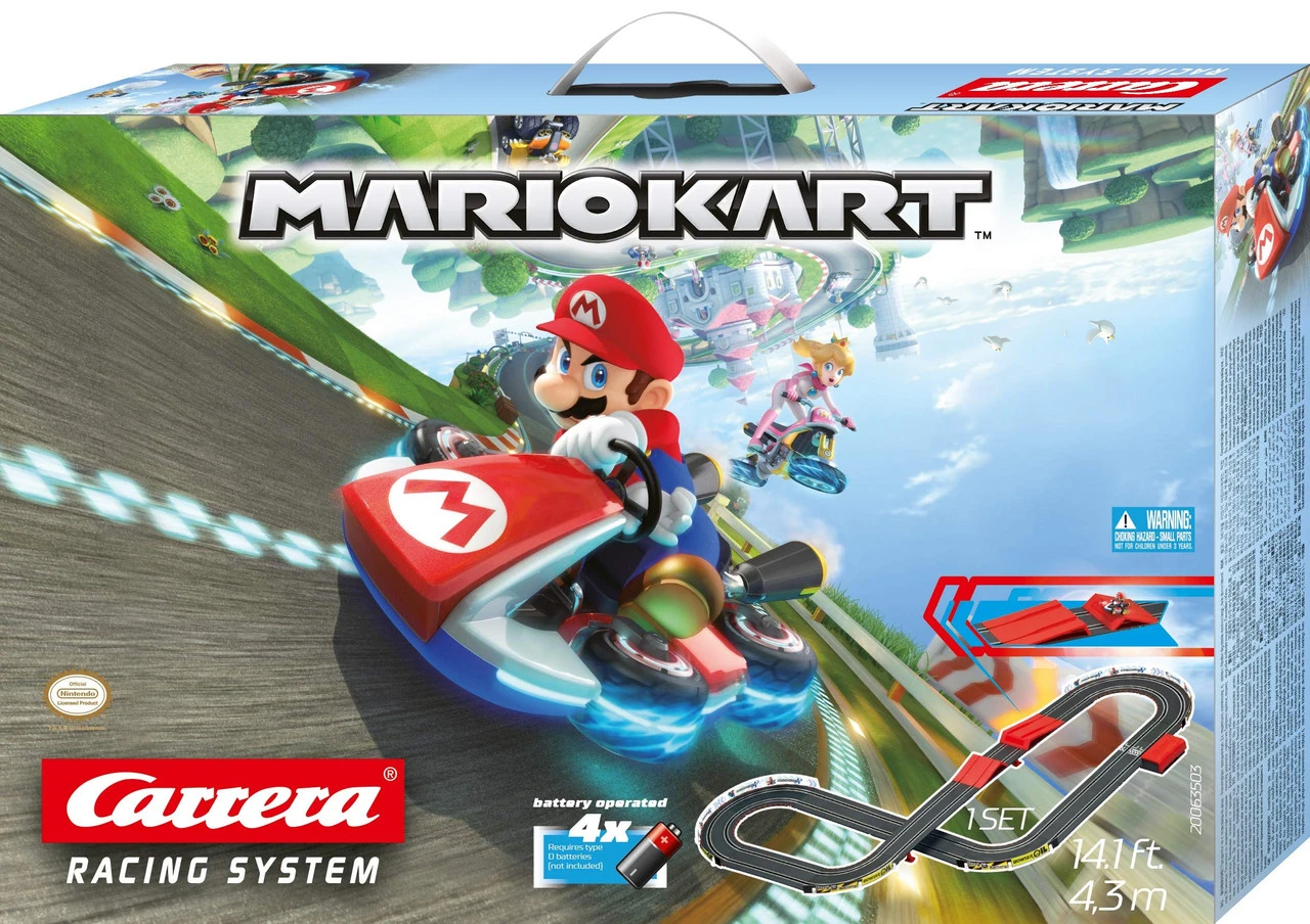Race head-to-head with this battery powered slot car racing track set featuring your favorite Nintendo Mario Kart characters! Carrera battery technology allows you to race with the same power and speed as an electric Carrera GO!!! slot car racing set! Hitting scaled speeds of up to 370-mph is no problem for Mario and Luigi as they speed around this 14.10-ft track. A two-piece removable jump ramp is also included for even more challenge and excitement as you sharpen your racing skills!Â