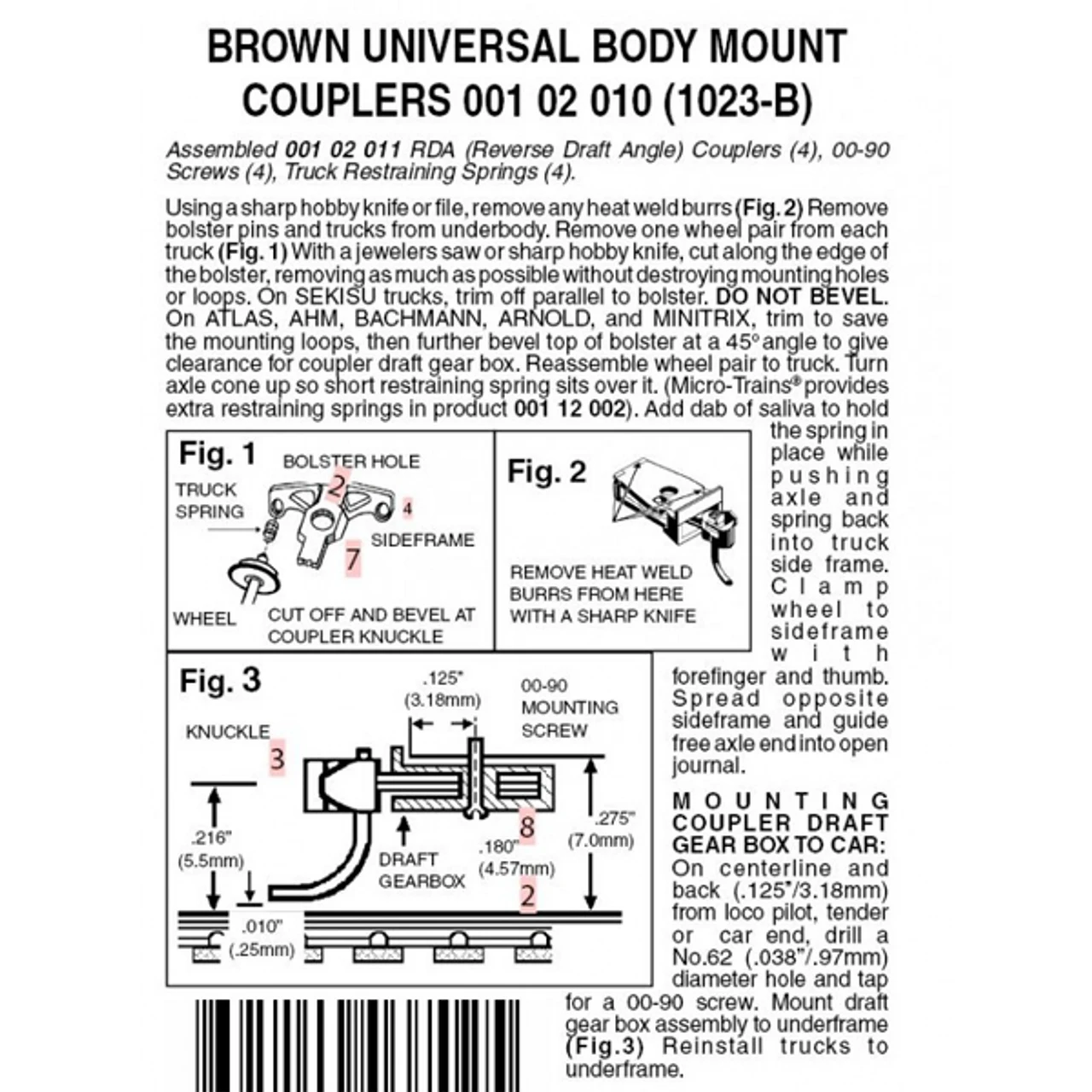 N Scale Assembled 001 02 011 RDA (Reverse Draft Angle) Couplers (4), 00-90 Screws (4), Truck Restraining Springs (4).