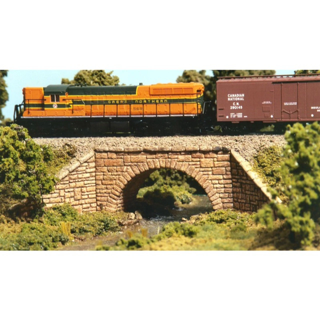 The stone work on this kit was carefully hand carved to accurately match the prototype. The bridge itself is made of a six piece unpainted kit made from a high density casting gypsum. Included are four wing walls, and a two part arch split down the middle. Complete assembly instructions are included. This will make a 40 scale foot single track bridge. Size: 1.5€H x 3€L (3.81cm x 7.62cm)