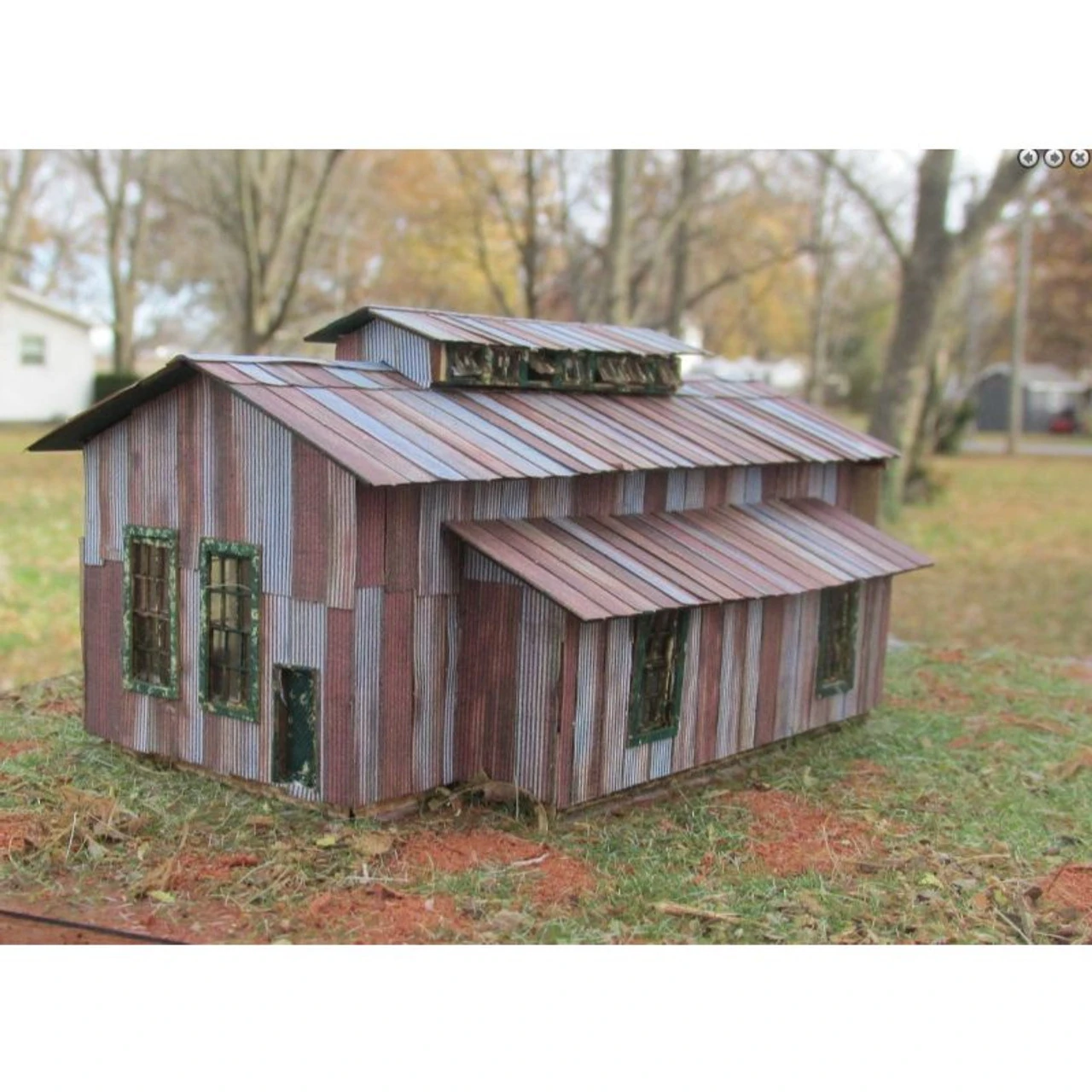 A small branch-line engine house or car shed. Will fit a GP-38 or 50 ft cars. Or use a as a heavy equipment repair building. Our weathered printed paper siding is supplied as shown. Foot print f 3 x 5 inches