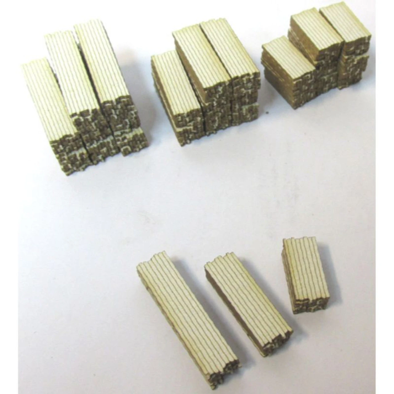 This kit has the parts for 27 lumber stacks. Each stack is 4 scale feet wide and tall. You get nine each at eight, twelve and sixteen feet long. Each stack is made from 6 layers of 1/32 Basswood colored Taskboard and have staggered ends , with the top and bottom layer being engraved for boards.