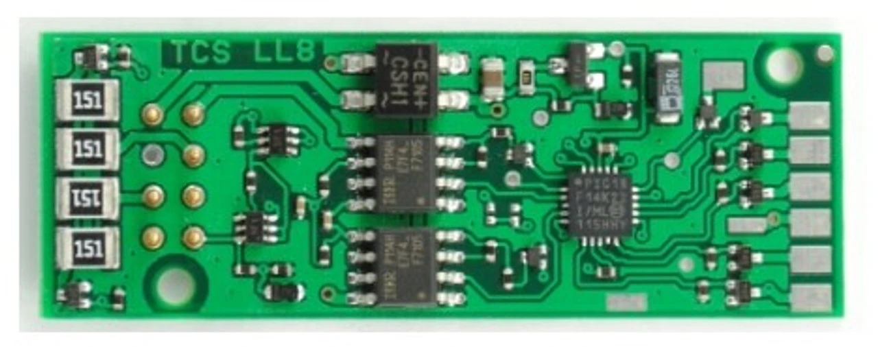 The LL8 is a 8-function direct-plug decoder designed specifically to meet the needs of LifeLike/Proto 2000 models. The LL8 can quickly be swapped for the existing DC board in your model, making the installation process fast and simple. The LL8 has a built-in circuit for the existing 1.5V bulbs used for the forward and reverse headlights. The remaining 6 lighting functions on the LL8 are rated for 12V.