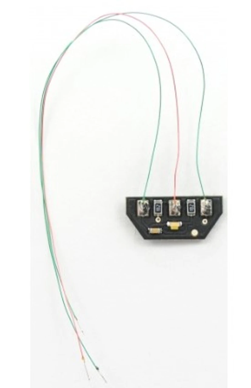 This board has three hookup wires – One RED Anode(+) wire (center) and two GREEN function wires(-). Simply solder the wires to the decoder as described below and your lighting kit will be ready to operate. (Also see the wiring diagram on the “Documents” tab) The K4-LK supplies light to the rear headlight as well as the rotary beacon on top.