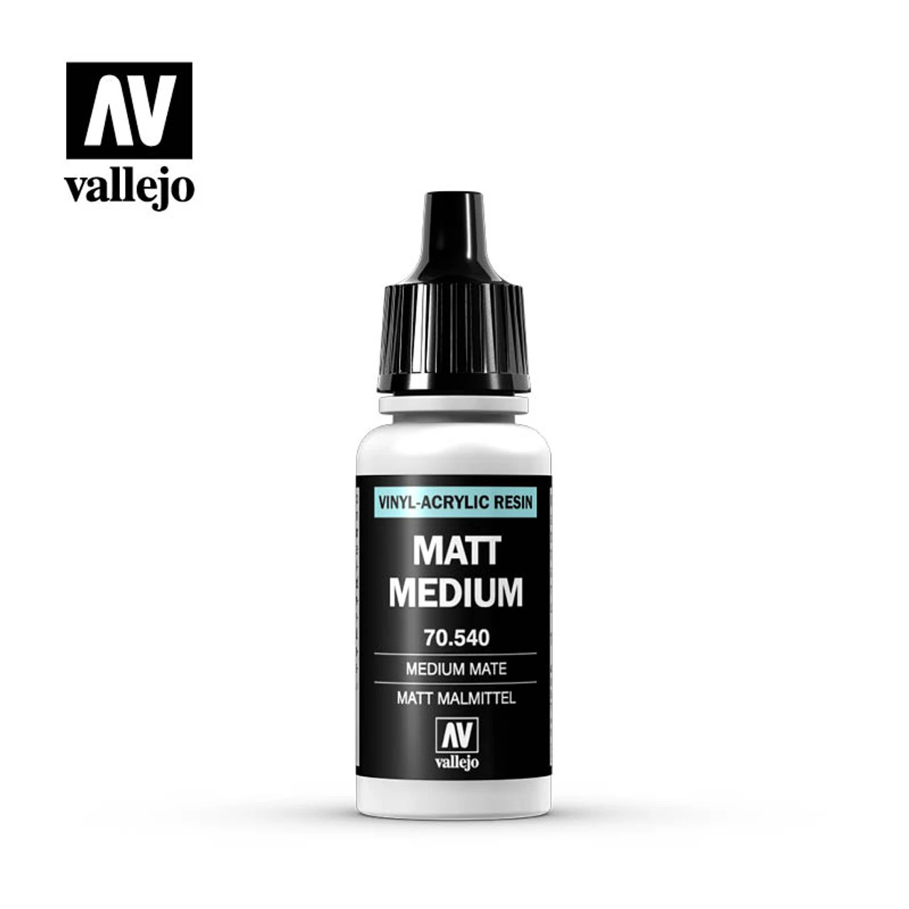 Vallejo 70-540 Matte Medium 17 ml Bottle Mat Medium extends the colors, increases their fluidity and transparence, and softens the blending of brushstrokes. It heightens the flexibility of the colors, and their adhesion to the surface. Does not yellow or change tonality of the color. Can also be used as a binder for dry pigment.