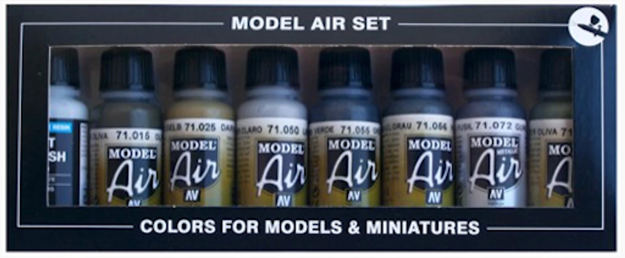 Description Collection of 8 color sets of Model Air for painting models and miniatures. Each one of these sets has a selection of special colors for painting vehicles, figures, etc. Contains 8 bottles of 17 ml. (with eyedropper) and color chart. *The RLM sets (German Lufwaffe XXII) & RAF-FAA contain a leaflet with a brief description of the colors and the part of the planes they were used. Colors 70.520 Matt Varnish 71.015 Dunkelgrün RLM71 71.025 Dunkelgelb RAL7028 71.050 Light Grey 71.055 Schwarzgrau RLM66 71.056 Dunkelgrau RAL7021 71.072 Gun Metal 71.096 Panzer Olivegr. 1943