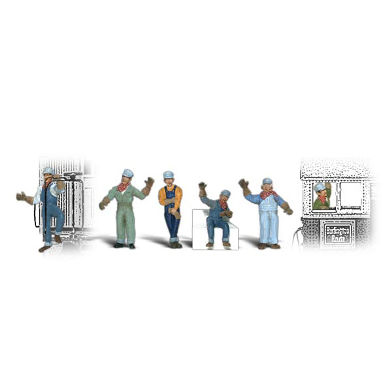 A set of men in bib overalls, work gloves and engineer hats. 6 pieces  Complete your scene and bring it to life with affordable works of art in N scale. Sculpted in fine detail and hand-painted, they add color, humor and interest to any layout. Scenic Accents figures have a natural charm and a realistic appearance that steal the show! Economy packages also available in N scale. Attach with Scenic Accents Glue and position with Gentle Grips®.