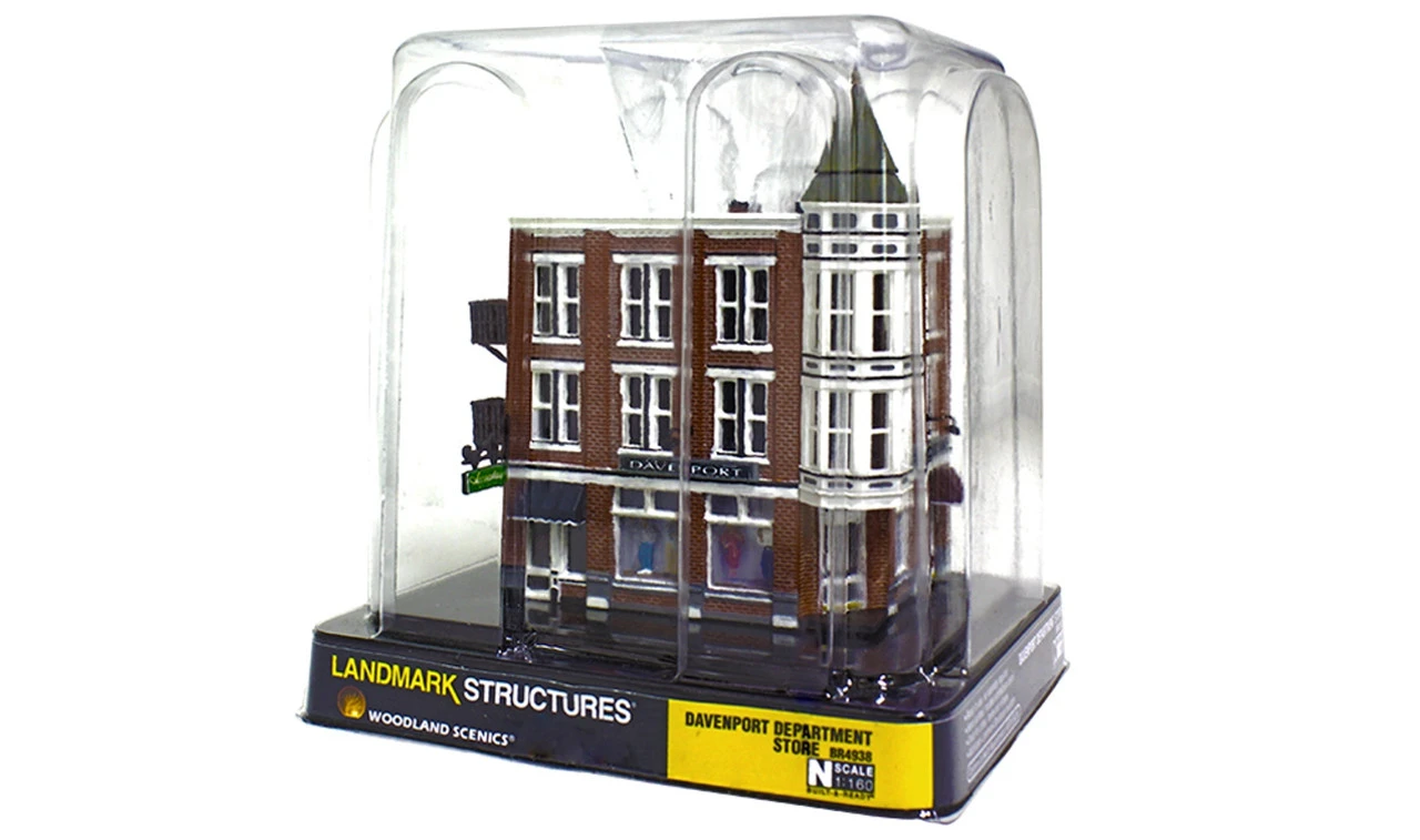 Davenport Department Store – N Scale The classic Victorian architecture of Davenport Department Store, with its two-story corner turret will dress up any downtown layout scene. Large first-floor picture windows feature mannequins and second and third floor windows feature a variety of window treatments. Other details include full roof detail, wrought-iron balconies and fire escape, signage, awnings and light fixtures. Colors may vary from actual product.