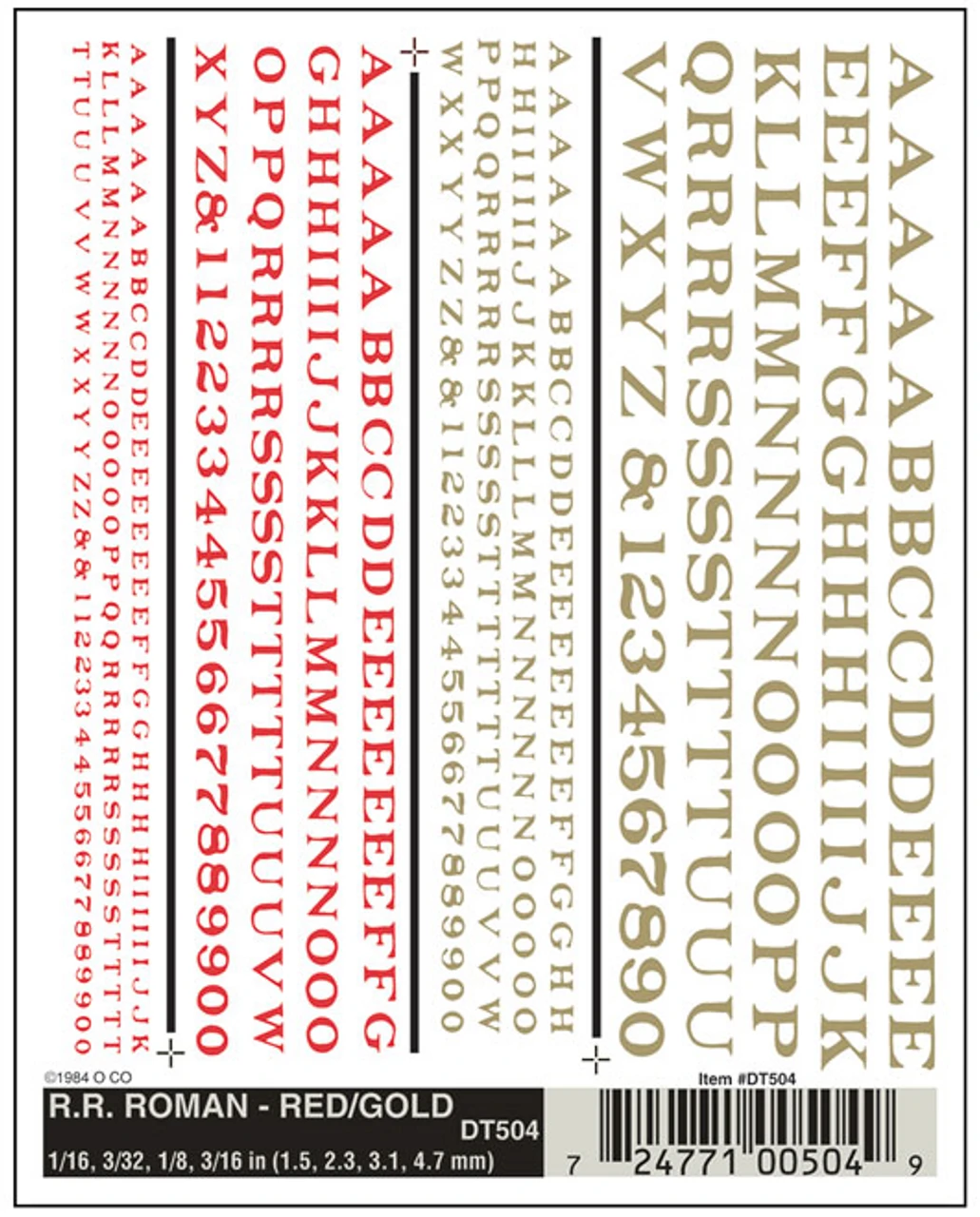 RR Roman Red/Gold DT504 Font sizes 1/16″, 3/32″, 1/8″, 3/16″ (1.5 mm, 2.3 mm, 3.1 mm, 4.7 mm) One sheet 4″ x 5″ (10.1 cm x 12.7 cm)