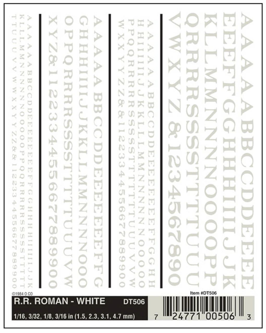 RR Roman White DT506 Font size 1/16″, 3/32″, 1/8″, 3/16″ (1.5 mm, 2.3 mm, 3.1 mm, 4.7 mm) One sheet 4″ x 5″ (10.1 cm x 12.7 cm)