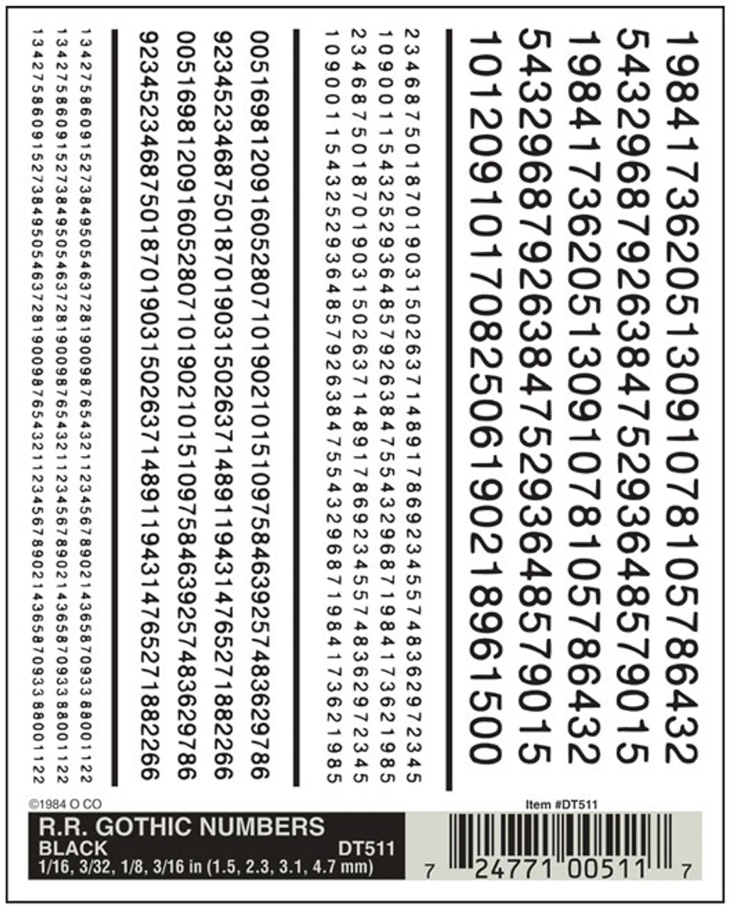 RR Gothic Numbers Black DT511 Font sizes 1/16″, 3/32″, 1/8″, 3/16″ (1.5 mm, 2.3 mm, 3.1 mm, 4.7 mm) One sheet 4″ x 5″ (10.1 cm x 12.7 cm)